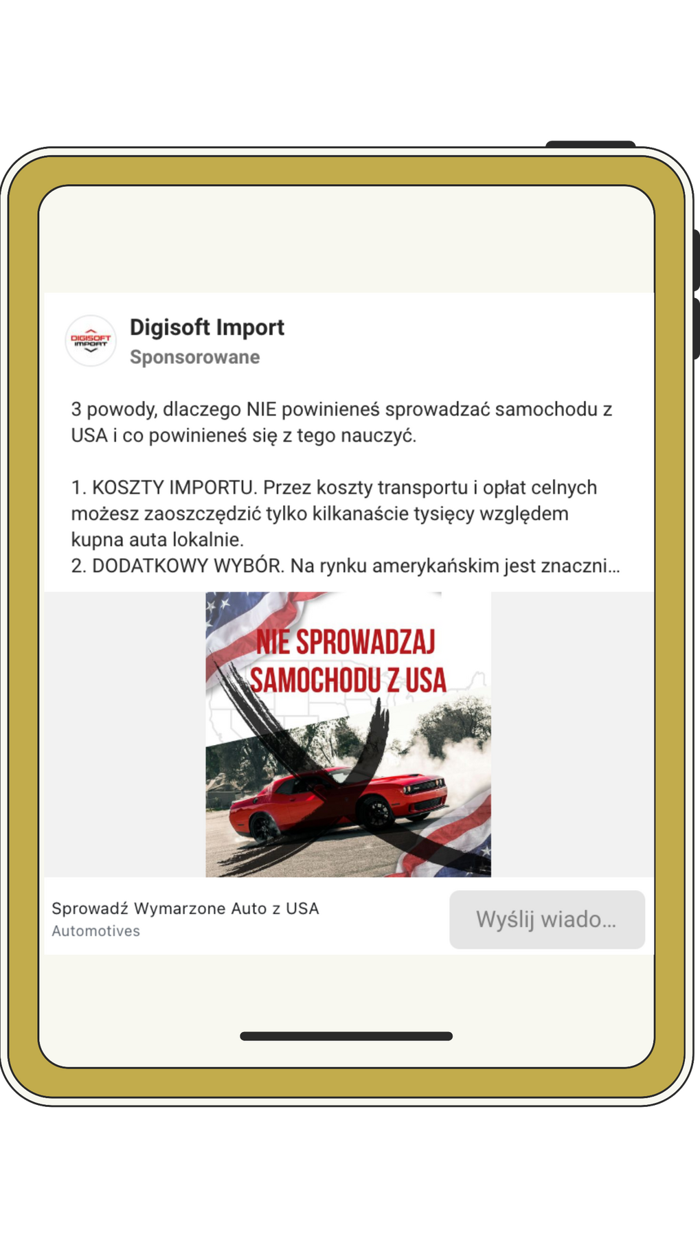 I was the architect of a highly successful Facebook advertising campaign for a car import dealership specializing in bringing vehicles from the USA to Poland. One standout ad that drove exceptional results featured an innovative approach: instead of focusing solely on the technical details of importing cars, I stood out by showing customers why they SHOULDN'T import cars from the USA—and especially not with our company! This divergent idea resonated with car enthusiasts, leading to an impressive CTR of 15.68% and an incredibly low CPC of $0.01, dramatically increasing inquiries for the dealership.