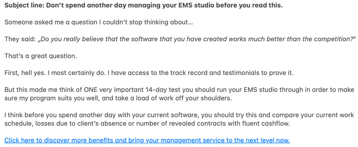 I managed an email newsletter campaign for a personal EMS (Electro Muscle Stimulation) training studio, helping them engage their clients and boost customer retention. By crafting personalized, informative emails, I kept their audience updated on special offers, new training programs, and health tips tailored to their fitness journey. The biggest benefits of email marketing in this context include building a strong client relationship through regular communication, increasing booking rates with exclusive offers, and providing valuable content that keeps the studio top-of-mind. It creates a consistent flow of returning clients while promoting trust and loyalty.