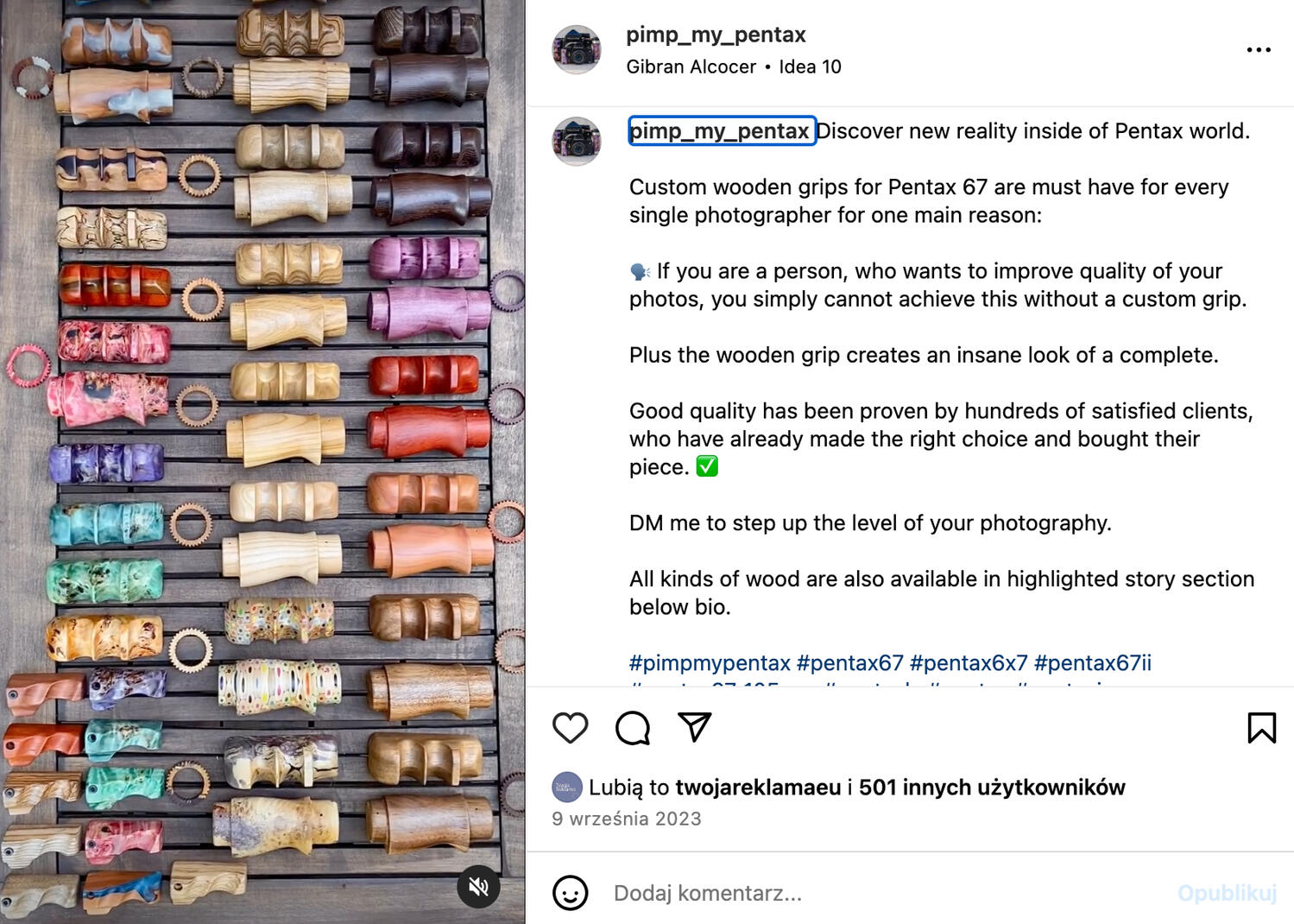 Organic social media optimization for a company selling Wooden Pentax Grips